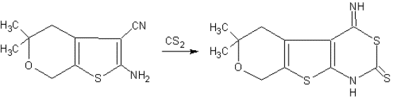 В круглодонную колбу емкостью 250 мл, снабженную мешалкой и обратным холодильником, помещают 8,32 г (0,04 моля) 2-амино-3-циано-5,5-диметил-4,5-дигидро-7Н-тиено/2,3-c/пирана (прим. 1), 10 мл сероуглерода и 60 мл пиридина (прим. 2). Реакционную смесь кипятят при перемешивании в течение 10 ч. После охлаждения выпавшие кристаллы отфильтровывают, промывают этиловым спиртом и перекристаллизовывают из 200 мл диметилсульфоксида (прим. 3). Выход 10,1-10,2 г или 97,0-97,8% теоретического количества, т.пл. 278-279°.