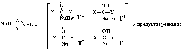 Реакции нуклеофильного присоединения и замещения карбонильных соединений играют важную роль в химии и биологии. В частности, к ним относятся реакции образования пептидных связей в условиях биосинтеза белка. Обычно эти реакции идут в водной среде. При этом растворитель играет роль резервуара, с которым происходит обмен протонами. Поэтому при подходе нуклеофильного реагента NuH к карбонильному соединению XCOY возможно образование интермедиатов с разным характером протонирования: