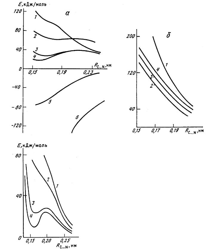 Рис. 2.5. Сечения ППЭ для реакции присоединения аммиака к формальдегиду с образованием биполярного интермедиата:а - расчеты полуэмпирическими методами: 1 - МПДП; 2 - МЧПДП/2; 3 - МЧПДП/2; 4 -МЧПДП/3; 5 - ППДП/БУ; 6 - ППДП/2; б - расчеты неэмпирическими методами: 1 - ОСТ-ЗГФ; 2 - 4-31ГФ; 3 - 6-31ГФ; 4 - 6-31ГФ*.