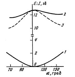 Рис. 1.1. Зависимость полных энергий метана (1) и его катион-радикала (2), а также зависимость ПИ метана (3) от угла Н—С—Н. За нуль принята полная энергия равновесной конформации метана.