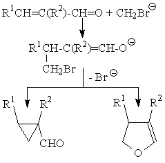 Выше был приведен пример, когда направление реакции (протонирования 1,2,4-о-ацетил-α-D-ксилопиранозы) определяется величиной теплового эффекта. Однако на опыте далеко не всегда протекает термодинамически наиболее выгодная реакция. Как было указано, скорость реакции определяется свободной энергией активации и в общем случае не коррелирует с ее теплотой. Решая прикладные задачи, приходится достаточно часто сталкиваться с такими реакциями. В качестве примера рассмотрим результаты, полученные в работе [54]. Из эксперимента было известно, что карбанионы, генерированные в условиях межфазного катализа из броммалонового эфира, присоединяются к незамещенным или монозамещенным в β-положении α,β-непредельным альдегидам R1CH=C(R2)CHO, образуя или формилциклопропаны (R2=H,CH3), или формил-4,5-дигидро-фураны (R2=СНО) (см. схему реакций на стр. 35).