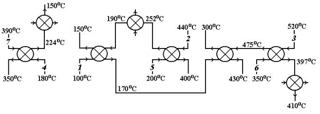 В качестве примера рассмотрим представленный в литературе /7/ пример синтеза системы теплообменников, обеспечивающей нагрев и охлаждение технологических потоков до заданных температур.