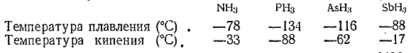 Арсин и стибин представляют собой бесцветные, очень ядовитые газы с чесночным (AsH3 ) или похожим на сероводородный (SbH3 ) запахом. Их точки плавления и кипения сопоставлены ниже с соответствующими данными для аммиака и фосфина: