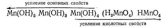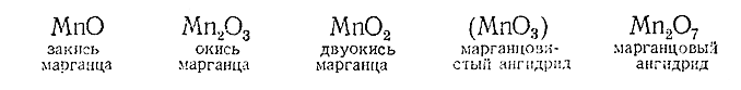 Марганец весьма интересен в химическом отношении, так как образует соединения, на которых может быть прослежено влияние изменения валентности элемента на свойства. Хорошо изучены его производные, отвечающие следующим окислам: