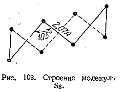 Эти переходы свойств при нагревании обусловлены изменением внутреннего строения серы. Для нее при обычных условиях характерны восьмиатомныекольцевые молекулы (рис. 103). Выше 160 °С кольца S8 начинают разрываться, переходя в открытые цепи, что сопровождается повышением вязкости (и изменением цвета). Дальнейшее нагревание выше 190 °С ведет к уменьшению средней длины подобных цепей, вследствие чего вязкость вновь понижается.