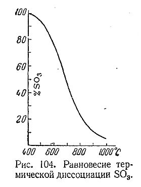 Эта форма SОз при хранении медленно переходит в другую форму, которая представляет собой белые шелковистые кристаллы, около 50 °С возгоняющиеся. Обе модификации очень гигроскопичны и дымят на воздухе. Термическая диссоциация серного ангидрида (на SO2 и О2 ) становится заметной около 400 °С и протекает тем в большей степени, чем выше температура , (рис. 104).