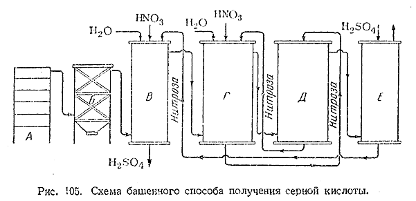 18) Принципиальная схема башенного способа получения H2 SO4 показана на рис. 105. Башни выкладываются из кислотоупорных керамических плит с наружным кожухом из листовой стали. Внутри они неплотно заполнены насадкой из кислотоупорной керамики. Поступающий из печи для сжигания пирита А газ освобождается от пыли в электрофильтре Б и затем подается в продукционные башни В и Г, где встречается со стекающей сверху «нитрозой», т. е. раствором окислов азота в крепкой серной кислоте. Раствор этот характеризуется следующими равновесиями: