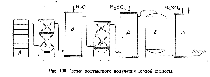 19) Принципиальная схема получения серной кислоты контактным способом показана на рис. 106. Образующиеся в печи А газы последовательно проходят через сухой электрофильтр Б, увлажнительную башню В, влажный электрофильтр Г, осушительную башню Д, содержащий катализатор контактный аппарат Е и поглотительную башню Ж. Из нижней части последней отбирается полученный олеум, а из верхней удаляются выхлопные газы (азот и др. ). Большинство контактных заводов работает в настоящее время не с платиновым, а с более дешевыми ванадиевыми катализаторами (V2 O5 с различными добавками.