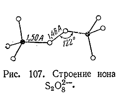 Пространственная структура отвечающего ей иона S2 O8 2–оказана на рис. 107. Каждая половина этого рисунка в отдельности соответствует строению сульфат–иона.