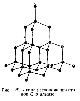 1) Как видно из рис. 129, каждый атом углерода в алмазе соединен с четырьмя другими, причем расстояние от его центра до центра любого из соседних одинаково (1,54 А). По отношению к каждому атому С четыре соседних расположены в углах охватывающего его правильного тетраэдра (рис. 124).