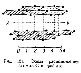 2) Каждый атом углерода в графите (рис. 131), как и в алмазе, соединен с четырьмя другими, и расстояния от него до трех других приблизительно одинаковы (1,42 А), однако от четвертого своего соседа он уже значительно более удален (3,35 А). В результате связь по последнему направлению гораздо слабее, чем по остальным. Внешне это выражается в легкой расщепляемость графита по показанной на рис. 131 линией АБ плоскости спайности кристалла на отдельные тонкие слои («чешуйки»).