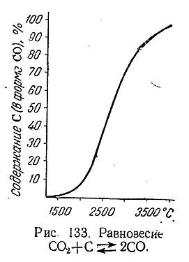 Реакция эта обратима, причем равновесие ее ниже 400°С практически нацело смещено влево, выше 1000°С – вправо (рис. 133). Однако с заметной скоростью оно устанавливается лишь при высоких температурах. Поэтому в обычных условиях СО вполне устойчива.