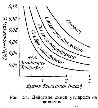9) Первыми признаками острого отравления окисью углерода являются головная боль и головокружение, в дальнейшем наступает потеря сознания. Рис 134 показывает зависимость физиологического действия СО от ее процентного содержания в воздухе и времени вдыхания последнего. Основным противоядием при отравлениях окисью углерода служит свежий воздух. Полезно также кратковременное вдыхание паров нашатырного спирта.
