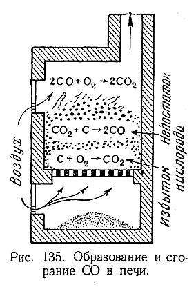 Из изложенного выше следует, что сгорание толстых слоев угля в печах идет по существу в три стадии, как это схематически показано на рис. 135. Преждевременное закрывание трубы, создавая в печи недостаток кислорода, может вызвать распространение СО по отапливаемому помещению и повести к отравлениям (т. н. угар). Следует отметить, что запах «угара» обусловлен не самой окисью углерода, а примесями некоторых органических веществ.