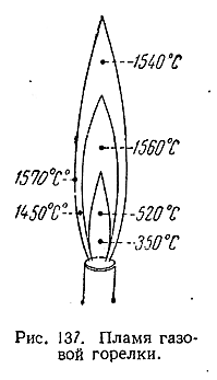25) При сжигании светильного газа в обычных газовых горелках «несветящееся» пламя слагается из трех конусов (рис. 137). Внутренний образован струей смешанного с воздухом газа, и горения в нем вовсе не происходит. В следующем конусе имеется избыток горючего материала и недостаток кислорода. Поэтому сгорание в нем происходит не полностью и пламя этой зоны является «восстановительным». Наконец, во внешнем конусе осуществляется полное сгорание при избытке кислорода воздуха, вследствие чего пламя здесь «окислительное». Приблизительное распределение температур отдельных точек пламени показано на рис. 137. Приведенные цифры могут рассматриваться только как ориентировочные (ввиду их сильной зависимости от состава газа).