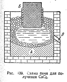 27) Электродами в схематически показанной на рис. 139 электрической печи получения СаС2 служат заполняющий ее дно толстый слой графита (А) опускающийся сверху массивный угольный блок (Б). Около стенок работающей печи, сохраняется корка из исходной смеси, пробиваемая при выпуске расплавленного карбида у отверстия В. Получение каждой тонны CaС2 требует затраты 3 тыс. киловатт–часов. Его ежегодная мировая выработка составляет около 5 млн. т.