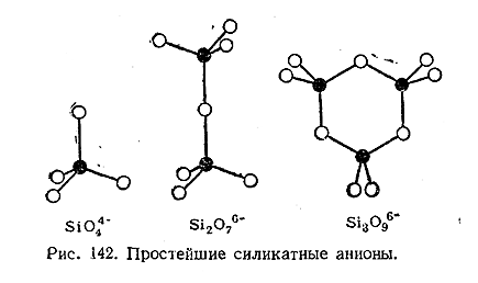 Некоторым из таких типов отвечают простейшие силикатные анионы. Как видно из рис. 142, сюда относятся прежде всего случаи заполнения узлов пространственной решетки индивидуальными ионами SiO4 4–. Второй тип характеризуется наличием в узлах решетки ионов Si2 O7 6– (образованных двумя тетраэдрами SiO4 4–с одним общим углом), третий – наличием в узлах решетки циклических ионов Si3 O9 6– (образованных тремя тетраэдрами SiO4 4–с двумя общимиуглами у каждого из них).
