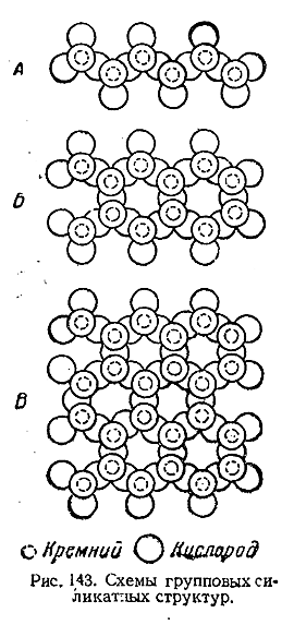 Другие типы силикатных структур могут быть названы групповыми, так как они слагаются из теоретически бесконечного числа тетраэдров Si4 4–. Такие сочетания (рис. 143) могут иметь характер простой цепи (А), двойной цепи (Б) или плоскости (В). Наконец, существуют типы, представляющие собой объемную структуру. Во всех подобных решетках часть ионов Si4+может быть заменена на ионы Аl3+ и т. д., а часть ионов О2– – на ионы ОН– и т. д. Вместе с тем часть входящих в состав силиката ионов (К+, Na+и т. д.) может располагаться между цепями или плоскостями, а также в промежутках трехмерной структуры.