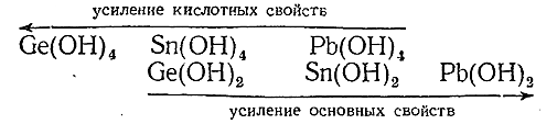 Наиболее отчетливо кислотные свойства выражены у гидрата двуокиси германия, который все же является очень слабой кислотой. Основные свойства наиболее отчетливо выражены у Pb(ОН)2 , который сообщает воде заметную щелочную реакцию.