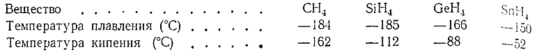 По физическим свойствам GeH4 и SnH4 похожи на аналогичные соединения Si и С. Они также представляют собой бесцветные газы с низкими температурами плавления и кипения, как это видно из приводимого ниже сопоставления.