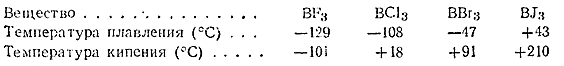 4) Строение молекул галогенидов ВГ3 отвечает плоскому треугольнику с атомом В в центре. Некоторые их свойства сопоставлены ниже: