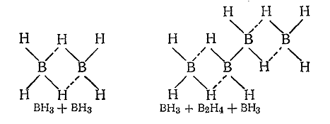 Молекулы летучих бороводородов следует, по–видимому, рассматривать как результат сочетания друг с другом приведенных выше валентнонасыщенных структур при посредстве особого рода водородных связей. Так, строение В2 Н6 и В4 Н10 выражается с этой точки зрения следующими схемами: