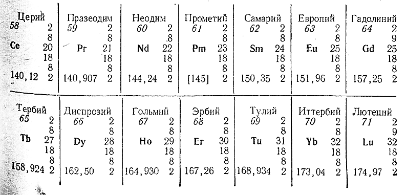 Как уже отмечалось в предыдущем параграфе, непосредственно к лантану примыкает 14 родственных Друг другу элементов, объединяемых под названием семейства лантанидов. Членами последнего являются: