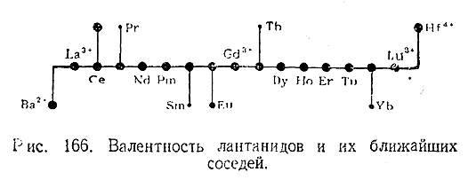 Все лантаниды, как правило, трехвалентны. Церий, кроме того, дает ряд производных, в которых он четырехвалентен. Известны также окислы четырехвалентных Рr и Тb и некоторые соли двухвалентных Sm, Eu и Yb. Однако соединения эти значительно менее характерны для рассматриваемых элементов, чем те производные, в которых они трехвалентны. Валентности лантанидов и их ближайших соседей по шестому периоду наглядно сопоставлены на рис. 166 (относительные размеры точек дают оценку характерности того или иного валентного состояния для данного элемента).