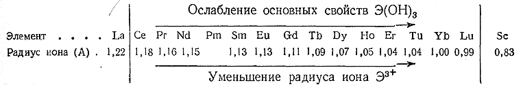 Гидроокиси Э(ОН)3 в воде почти нерастворимы. Все они имеют только основной характер. По степени его выраженности гидроокиси лантанидов можно расположить в ряд, совпадающий с рядом ионных радиусов тех же элементов: