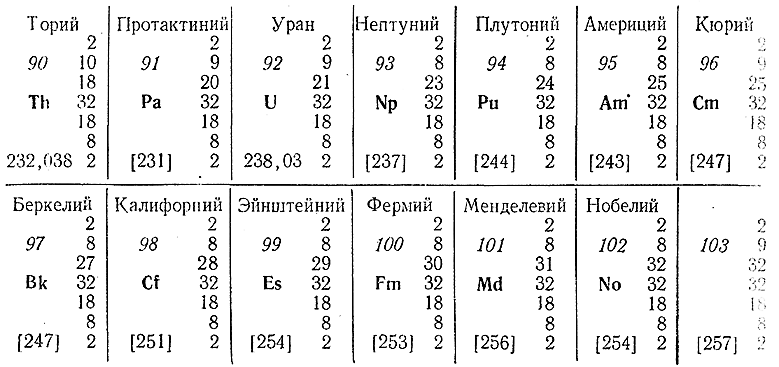 Наиболее характерные валентности выделены жирным шрифтом, а наименее характерные или малоизученные даны в скобках. Как видно из приведенного сопоставления, первоначально (от Th до U) имеет место возрастание наиболее характерной валентности, а затем (от U до Cm) – ее снижение.