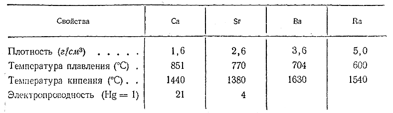 В свободном состоянии элементы подгруппы кальция могут быть получены электролизом их расплавленных солей. Они представляют собой серебристо–белые металлы. Кальций довольно тверд, стронций и особенно барий значительно мягче. Некоторые константы щелочноземельных металлов сопоставлены в приводимой таблице.