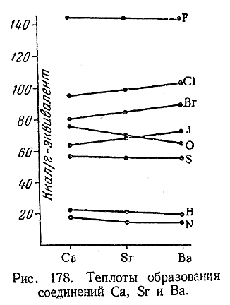 С металлоидами щелочноземельные металлы соединяются весьма энергично и с значительным выделением тепла, как это видно из рис. 178. Особенно интересны гидриды ЭН2 , образующиеся при нагревании кальция и его аналогов з токе сухого водорода.