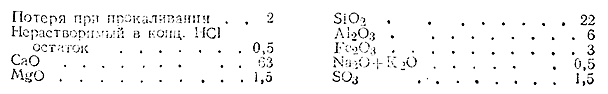 5) Состав цементов выражают обычно в виде весового процентного содержания входящих в них окислов (в основном CaO, SiO2 , Al2 O3 и Fe2 O3 ). Первый из них играет в цементе роль основания, остальные – роль кислотных ангидридов, весовое отношение СаО / (SiO2 + Al2 O3 +Fe2 O3 ) носит название гидромодуля цемента и хорошо характеризует его качества. Числовая величина гидромодуля обычного (силикатного) цемента колеблется около двух. Приблизительные типичные результаты его анализа приводятся ниже (% по весу):
