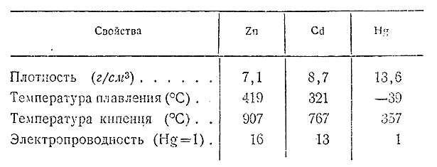 Элементы подгруппы цинка представляют собой белые металлы с синеватым (Zn) или серебристым (Cg, Hd) оттенком. На влажном воздухе они покрываются пленками окислов и теряют свой блеск. Все три металла (особенно ртуть) легкоплавки. Их важнейшие константы сопоставлены в приводимой таблице.