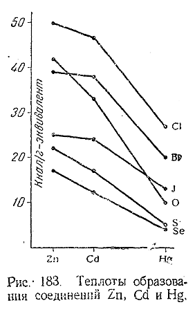 В соприкосновении с сухим воздухом Zn, Cd и Hg при обычной температуре не изменяются. Будучи достаточно нагреты, Zn и Cd сгорают до окислов ЭО, тогда как ртуть окисляется лишь медленно. Взаимодействие Zn и Cd с серой протекает также весьма энергично, но для начала реакции требуется нагревание. Напротив, ртуть соединяется с мелко раздробленной серой (при растирании обоих элементов в ступке) уже на холоду. Аналогичные различия наблюдаются и в отношении этих металлов к галоидам, с которыми при обычных условиях ртуть реагирует легче, чем Zn и Cd. Эта повышенная химическая активность ртути обусловлена ее жидким агрегатным состоянием, сильно облегчающим протекание реакций. По существу же металлические свойства элементов в ряду Zn–Cd–Hg заметно ослабляются. Это видно, частности, из приведенного на рис. 183 сопоставления теплот образования аналогичных соединений рассматриваемых элементов: при переходе от Zn к Hg они во всех случаях уменьшаются.