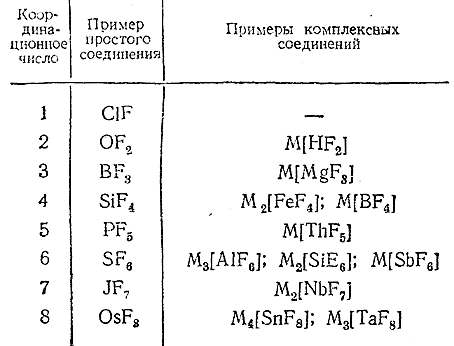 Кислородные кислоты и их соли можно, следовательно, считать Устным случаем комплексов рассматриваемого типа (так называемых ацидокомплексов). Наряду с кислородом, хлором и другими элементарными отрицательными ионами в качестве аддендов при образовании ацидокомплексов (т. е. соединений с комплексным анионом) могут фигурировать и такие кислотныерадикалы, как CN–, NO2 –, NO3 –, СО3 2–, SO3 2–, SO4 2–и др. С другой стороны, комплексообразователями могут быть очень многие элементы и притом нередко в различных валентных состояниях. Поэтому число известных ацидо–комплексов весьма велико и состав их довольно разнообразен, как это видно, например, из приводимого сопоставления для фторидов (М – одновалентный металл).
