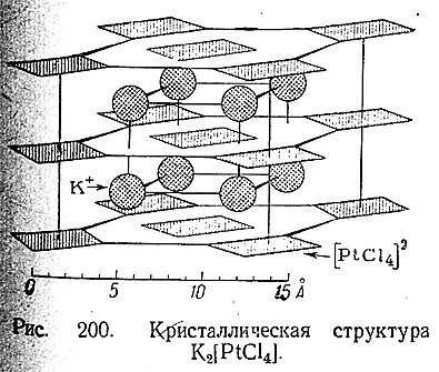 Пространственная структура внутренней сферы комплекса определяется, в основном, координационным числом и стремлением к достижению максимальной компактности (плотности) упаковки частиц. Если представить себе комплексообразова–тель находящимся в центре соответствующей фигуры, то для координационного числа 6 характерно расположение адден–дов по углам октаэдра (рис. 198, Л), а для координационного числа 4 – по углам тетраэдра (рис. 198, Б). Октаэдрическое расположение аддендов было установлено, в частности, для иона (PtCl6 ]2–(рис. 199). При координационных числах 4 и ниже значительную роль для относительной устойчивости того или иного пространственного расположения играют индивидуальные особенности комплексообразователя и аддендов. Поэтому, например, для координационного числа 4, кроме тетраэдрического, стано вится возможным и расположение аддендов по углам квадрата (с комплексообразователем в центре характерное, в частности, для производных двухвалентной платины (рис. 200).