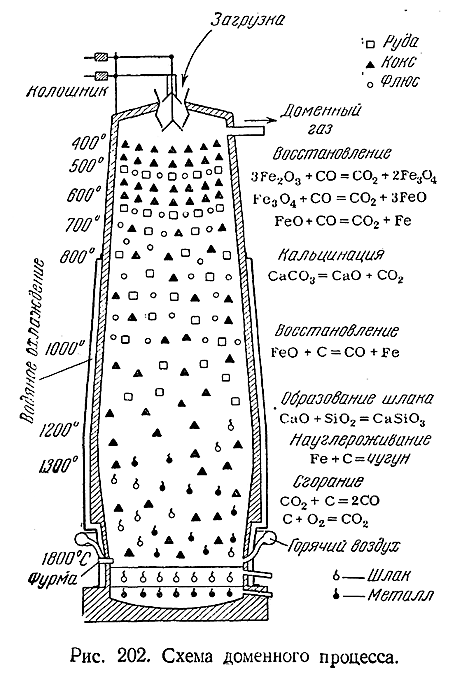 По характеру своей работы домна (рис. 202) является печью непрерывного действия. Будучи раз введена в эксплуатацию («задута»), она затем безостановочно функционирует в течение нескольких лет, Для поддержания процесса, сводящегося, в основном, к восстановлению железа из его окислов, сверху через колошник вводится «шихта», т. е. последовательные слои железной руды, кокса и т. н. флюсов – специальных добавок (чаще всего СаСО3 ), необходимых для придания легкоплавкости образующемуся шлаку. Снизу через фурмы в домну все время вдувается воздух, предварительно нагретый до 600–800°С. За счет сгорания кокса температура в нижней части домны поддерживается на уровне приблизительно 1800°С. По направлению кверху она постепенно понижается и у колошника равна около 400°С. Накапливающиеся на дне печи расплавленный металл и жидкий шлак периодически выпускаются через специальные отверстия. Последовательный ход доменного процесса виден из рис. 202.