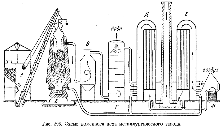 5) Схема доменного цеха металлургического завода показана на рис. 203. При помощи механизированного загрузочного устройства (Л) домна (Б) периодически снабжается свежими порциями шихты. Образующиеся при процессе газы, пройдя через пылевую камеру (В) и скруббер (Г), сгорают в каупере (Е), накаливая внутреннюю обкладку последнего. Параллельно через предварительнонакаленный подобным же образом другой каупер (Д) воздуходувка (Ж) гони? воздух в фурмы доменной печи. Через некоторое время роли кауперов Е и Д меняют: первый становится охлаждающимся, второй нагреваемым. Каждую домну обычно обслуживает несколько кауперов.