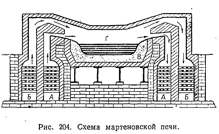 7) Температура затвердевания доменного чугуна обычно лежит около 1200 °С (причем переход из жидкого в твердое состояние сопровождается увеличением объема). Для переработки его на сталь (или ковкое железо) основное значение имеет мартеновский процесс, основанный на использовании так называемой регенеративной печи. Принцип метода заключается в выжигании из доменного чугуна примесей за счет кислорода воздуха, проходящего над расплавленным металлом, и кислорода добавляемых к нему окислов железа (в виде ржавого железного лома или чистой железной руды). Необходимая для поддержания металла з жидком состоянии высокая температура достигается сжиганием над ним смеси горючего газа и воздуха (в избытке), предварительно сильно нагретых за счет тепла отходящих газов. Конструктивно это предварительное нагревание осуществляется в мартеновской печи путем периодического изменения направления потока газов на обратный. Пусть, как показано на рис. 204 стрелками, горючий газ (А) и воздух (Б) входят первоначально слева. Смешиваясь у начала пространства над расплавленым металлом (Г), они сгорают, причем отходящие газы нагревают камеры А и Б правой части печи. После того как эти камеры достаточно накалятся, ток газа и воздуха меняют на обратный. Теперь правые камеры отдают им свое тепло, а левые накаливаются отходящими газами и т. д. При пользовании для нагревания мартеновской печи сжиганием нефти (вбрызгиваемой прямо в пространство над металлом) камеры А становятся излишними.