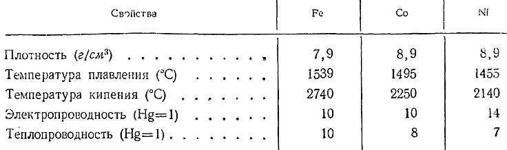 В химически чистом состоянии железо, кобальт и никель могут быть получены восстановлением их окислов водородом или элекролизом растворов солей. Все три элемента представляют собой блестящие белые металлы с сероватым (Fe, Co) или серебристым (Ni) оттенком. Важнейшие их константы сопоставлены ниже: