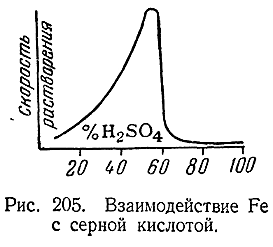 Зависимость скорости взаи модействия Fe с серной кислотой от ее концентрации показана на рис. 205. Устойчивость к действию концентрированной HNO3 по ряду Fe–Со–Ni быстро уменьшается. Cuльные щелочи на все три элемента не действуют.