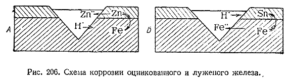 13) Если взаимодействию с влажным воздухом или водой подвергается химически чистый металл, то выделяющийся первоначально водород в большей или меньшей степени удерживается его поверхностью и предохраняет последнюю от дальнейшей коррозии. При наличии контакта двух разных металлов создается гальваническая пара (V § 8 доп. 1), причем водород выделяется только на менее активном из них, который тем самым и предохраняется от коррозии. Напротив, более активней металл в этом случае разрушается быстро. Поэтому, например, ржавление оцинкованного железа, с одной стороны, и луженого – с Другой, при нарушении цельности защитного слоя протекает совершенно различно. В первом случае (А, рис. 206) местное повреждение поверхности ведет к дальнейшему разъеданию защитного слоя цинка, тогда как ржавление железазадерживается. Во втором (Б, рис. 206), начиная от поврежденного места происходит дальнейшее ржавление железа под остающимся неизменным слоем олова. Оперенными стрелками на обеих схемах рис. 206 показано направление перехода электронов в соприкасающихся металлах.