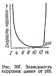 15) Всякие условия, способствующие образованию защитных пленок или повышению их прочности, будут, оче видно, увеличивать устойчивость металла по отношению к коррозии. Действующим в этом направлении веществом (ингибитором коррозии) применительно к железу является, в частности, ион ОН–. Напротив, повышение концентрации ионов Н+ (благодаря, например, растворению СОг в соприкасающейся с металлом воде) ведет к значительному ускорению коррозии. У металлов, образующих амфотерные гидроокиси, максимум коррозионной устойчивости наблюдается при некоторых средних значения pH (рис. 207).