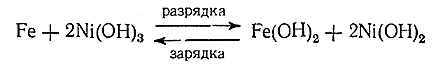 16) Помимо окисления Ni(ОН)2 чисто химическим путем, перевод его в гидроокись может быть достигнут электроокислением в щелочной среде. Процесс этот, наряду с использованием для обратного получения электрического тока сильных окислительных свойств Ni(ОН)3 , лежит в основе действия т. н. щелочного аккумулятора. Последний содержит один электрод, сформованный из порошка металлического Fe, другой – из водной окиси никеля. Оба электрода опушены в раствор КОН. Процессы при разрядке и зарядке могут быть переданы схемой:
