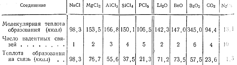 Взаимодействие между элементами протекает, как правило, тем более энергично, чем сильнее они отличаются друг от друга по своему химическому характеру. Поэтому, например, теплоты образования соединений между членами одного и того же периода обычно тем больше, чем дальше они расположены друг от друга. В качестве иллюстрирующего эту закономерность примера ниже приводятся теплоты образования некоторых соединений между элементами 3 и 2 периодов. Так как формулы этих соединений различны, данные для них непосредственно сопоставляться не могут и должны быть предварительно приведены к сравнимому виду. Для этого теплоты образования грамм–молекул делят на число имеющихся в соединении валентных связей и получают таким образом величины, отнесенные к одному грамм–эквиваленту (теплоты образования «на связь»). Последние уже могут быть сопоставлены друг с другом. Ход расчета виден из данных приводимой ниже таблицы.