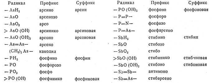 (d) Следующий список включает префиксы и суффиксы, применимые к большинству обычных соединений фосфора, мышьяка и сурьмы: