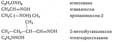 35. Производные гидроксиламина, полученные замещением водорода в гидроксиле, рассматриваются как алкоксильные производные: те же производные, в которых замещен один из атомов водорода группы NH2, рассматриваются как алкилгидроксиламины. Названия оксимов производятся из названия соответствующего альдегида, кетона или хинона с добавлением суффикса -оксим.