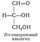 D — обозначение (от слова dexter — правый), указывающее на принадлежность одного из пары зеркальных изомеров (энантиомеров) к ряду соединений с определенной пространственной конфигурацией (D-ряд, или ряд D-глицеринового альдегида). Зеркальные изомеры с противоположной пространственной конфигурацией обозначают символом L (от слова laevus— левый), что также указывает на принадлежность их к стерическому ряду (L-ряд, или ряд L-глицеринового альдегида). Проекционные формулы зеркально-изомерных глицериновых альдегидов:
