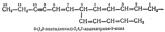 3.3. — Ненасыщенные неразветвленные ациклические углеводороды, имеющие как двойные, так и тройные связи, называют, заменяя в названии соответствующего насыщенного углеводорода окончание -ан окончаниями -енин, -адиенин, -атриенин, -ендиин и т. д. Двойные и тройные связи должны получить возможно более низкие номера, даже если при этом -ин получит меньший номер чем -ен. Если же при нумерации возможен выбор, наименьшими номерами следует обозначить двойные связи.